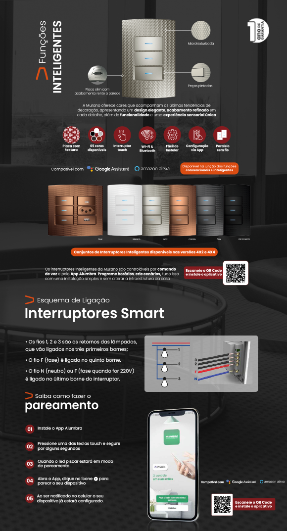 Com 12 meses de garantia, este interruptor vem com um QR Code na embalagem que direciona para o manual de instalação, tornando o processo ainda mais fácil.